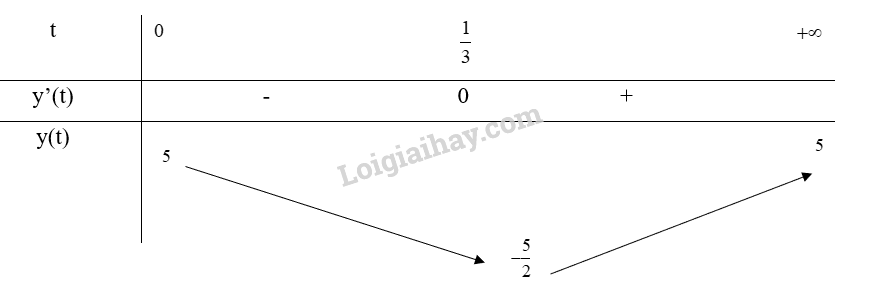 Từ bảng biến thiên, ta thấy \(\mathop {\min }\limits_{[0; + \infty )} y(t) = y(\frac{1}{3}) =  – \frac{5}{2}\) và \(\mathop {\max }\limits_{[0; + \infty )} y(t) = y(0) = 5\)