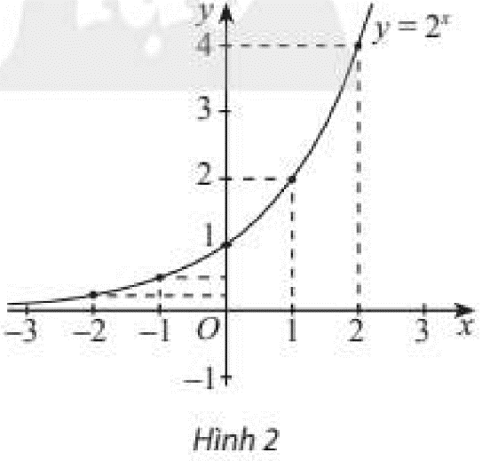 ii) Trong mặt phẳng toạ độ \(Oxy\), xác định các điểm có toạ độ như bảng trên. Làm tương tự, lấy nhiều điểm \(M\left( {x;{2^x}} \right)\) với \(x \in \mathbb{R}\) và nối lại ta được đồ thị hàm số \(y = {2^x}\) như Hình 2. Từ đồ thị nảy, nêu nhận xét về tính liên tục, tính đồng biến, nghịch biến, giới hạn khi \(x \to  + \infty ,x \to  – \infty \) và tập giá trị của hàm số đã cho.