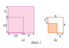 b) Một mảnh vườn hình vuông sau khi mở rộng mỗi cạnh \(5\)m thì được một mảnh vườn hình vuông có cạnh là \(x\) (m) như Hình 2b. Viết biểu thức (dạng đa thức thu gọn) biểu thị diện tích mảnh vườn trước khi mở rộng.