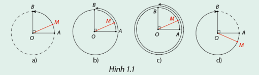 Trong mỗi Hình 1.1a, 1.1b, 1.1c và 1.1d, điểm M di động trên đường tròn tâm O từ A đến B theo chiều mũi tên.