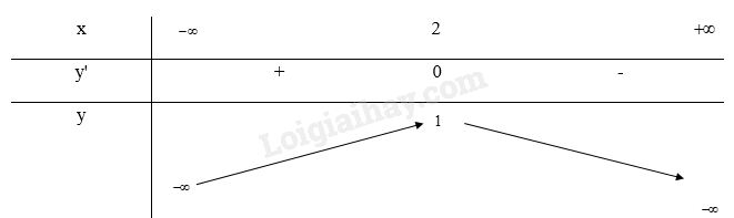 Trên các khoảng (\( – \infty \); 2) thì y’ > 0 nên hàm số đồng biến trên mỗi khoảng đó. Trên khoảng (2; \( + \infty \)) thì y’ < 0 nên hàm số nghịch biến trên khoảng đó.