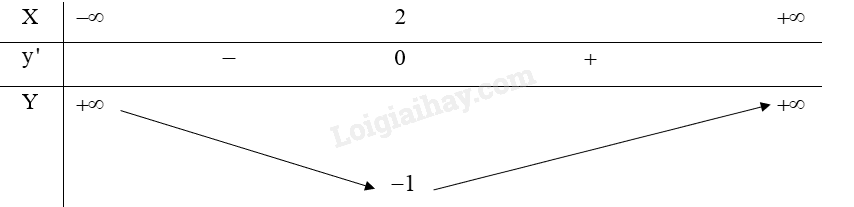 Hàm số đạt cực tiểu tại \(x = 2,\) giá trị cực tiểu \({y_{CT}} = – 1\). Hàm số không có cực đại.