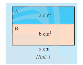 Một hình chữ nhật lớn được ghép bởi hai hình chữ nhật A và B lần lượt có diện tích là \(a\) \(c{m^2}\) và có cùng chiều dài \(x\) cm (Hình 1).
