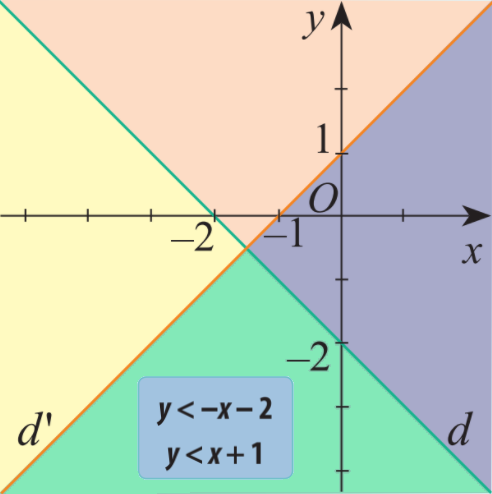 Vậy miền nghiệm của hệ bất phương trình \(\left\{ \begin{array}{l}y <  – x – 2\\y < x + 1\end{array} \right.\) là miền màu xanh (không kể các bờ d, d’)