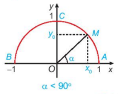 Khi \(\alpha  < {90^o}\), điểm M thuộc vào cung AC (bên phải trục tung)