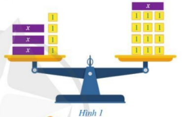 –         Ta thấy ở đĩa cân bên trái có 3 hộp màu tím mỗi hộp có khối lượng \(x\) kg và 4 hộp màu vàng mỗi hộp có khối lượng 1 kg nên biểu thức biểu diễn tổng khối lượng các hộp xếp ở đĩa cân bên trái là:
