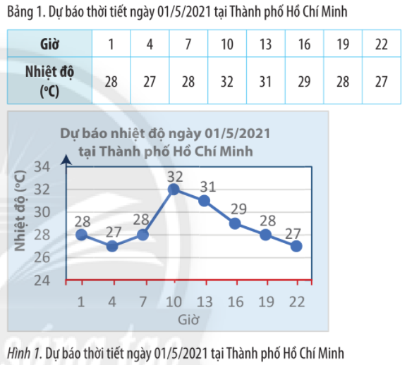 Bản tin dự báo thời tiết cho biết nhiệt độ ở một số thời điểm trong ngày 01/5/2021 tại thành phố Hồ Chí Minh đã được ghi lại thành bảng kèm với biểu đồ bên.