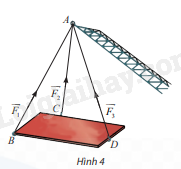 Trong Hình 4, cho biết ba vectơ \(\overrightarrow {{F_1}} ;\overrightarrow {{F_2}} ;\overrightarrow {{F_3}} \) biểu diễn lực căng của các sợi dây cáp AB, AC, AD tác dụng lên vật nặng. Giá của ba vectơ này có cùng nằm trên một mặt phẳng không?