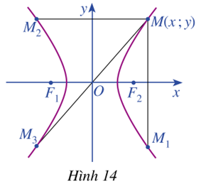 Trong mặt phẳng tọa độ \(Oxy\), ta xét hypebol (H) với phương trình chính tắc \(\frac{{{x^2}}}{{{a^2}}} – \frac{{{y^2}}}{{{b^2}}} = 1\) trong đó \(a > 0,b > 0\) (Hình 14). Cho điểm \(M\left( {x;y} \right)\) nằm trên hypebol (H). Gọi \({M_1},{M_2},{M_3}\) lần lượt là điểm đối xứng của M qua trục Ox, trục Oy và gốc O. Các điểm \({M_1},{M_2},{M_3}\) có nằm trên hypebol (H) không? Tại sao?