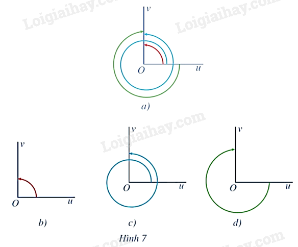 Trong Hình 7a, ba góc lượng giác có cùng tia đầu Ou và tia cuối Ov, trong đó Ou ⊥ Ov. Xác định số đo của góc lượng giác trong các Hình 7b, 7c, 7d.