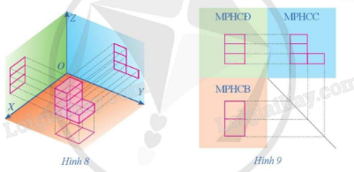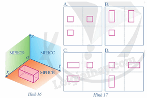 Khối hộp chữ nhật ở Hình 16 có các cạnh song song hoặc vuông góc với các tia OX, OY, OZ. Theo phương pháp góc chiếu thứ nhất, bản vẽ nào ở Hình 17 biểu diễn cho khối hộp chữ nhật đó?