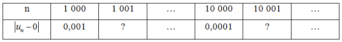 Kể từ số hạng \({u_n}\) nào của dãy số thì khoảng cách từ \({u_n}\) đến 0 nhỏ hơn 0,001? 0,0001?