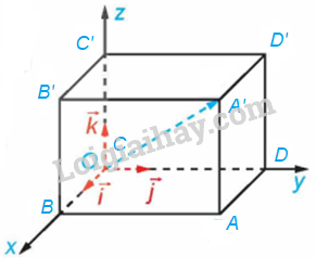 Do đó, suy ra có thể lập một hệ tọa độ Oxyz có gốc O trùng với đỉnh C và các vectơ \(\overrightarrow i ,\overrightarrow j ,\overrightarrow k \) lần lượt cùng hướng với các vectơ \(\overrightarrow {CB} ,\overrightarrow {CD} ,\overrightarrow {CC’} \).