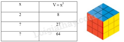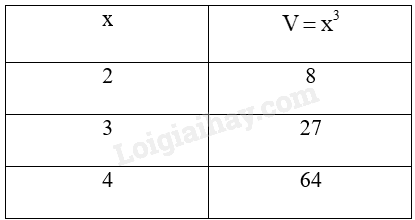Kí hiệu V là thể tích của hình lập phương với cạnh x. Hãy thay dấu “?” trong bảng sau bằng các giá trị thích hợp.