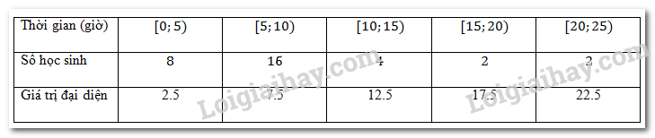 Thời gian xem ti vi trung bình trong tuần trước của các bạn học sinh này là:\({\rm{\;}}\bar x = \frac{{8 \times 2.5 + 16 \times 7.5 + 4 \times 12.5 + 2 \times 17.5 + 2 \times 22.5}}{{8 + 16 + 4 + 2 + 2}} = 8.4375\) (giờ).