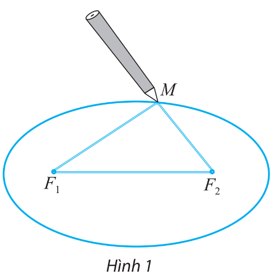 Lấy một tấm bìa, ghim hai cái đinh lên đó tại hai điểm \({F_1}\)\({F_2}\). Lấy một vòng dây kín không đàn hồi  có độ dài lớn hơn hai lần đoạn \({F_1}{F_2}\). Quàng vòng dây đó qua hai chiếc đinh và kéo căng tại một điểm M nào đó. Tựa đầu bút chì vào trong vòng dây tại điểm M rồi di chuyển sao cho dây luôn luôn căng. Đầu bút chì vạch lên tấm bìa một đường mà người ta gọi là đường elip.
