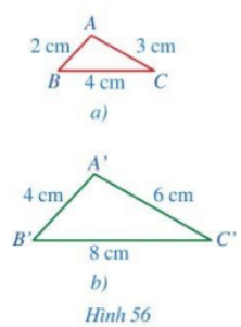 Quan sát Hình 56 và so sánh các tỉ số: \(\frac{{A’B’}}{{AB}};\,\,\frac{{A’C’}}{{AC}};\,\,\frac{{B’C’}}{{BC}}\).