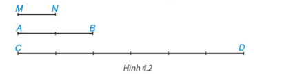Cho Hình 4.2, em hãy thực hiện các hoạt động sau: Hãy tìm độ dài của hai đoạn thẳng AB và CD nếu chọn đoạn MN làm đơn vị độ dài. Với các độ dài đó hãy tính tỉ số (dfrac{{AB}}{{C{rm{D}}}})