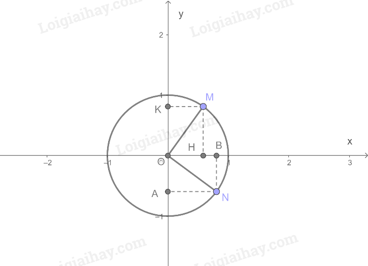Trên đường tròn lượng giác, gọi M và N lần lượt là điểm biểu diễn của góc lượng giác có số đo \(\frac{{9\pi }}{4}\) và \( – \frac{\pi }{6}\). Tìm tọa độ của M và N.