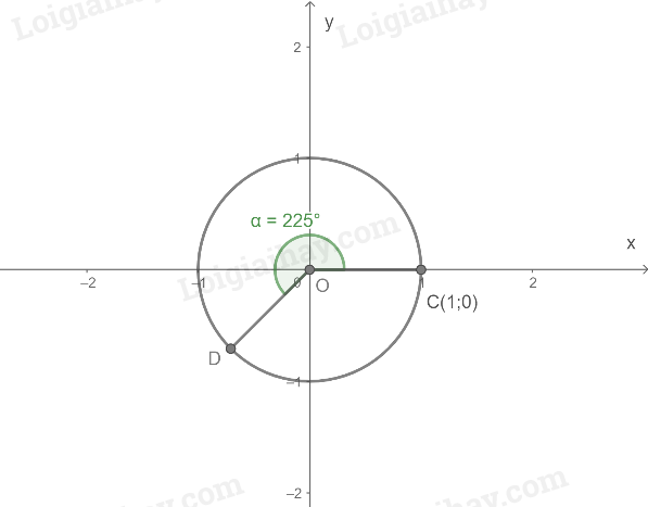 Hoành độ của điểm D là \(\cos {225^0}\), tung độ của điểm D là \(\sin {225^0}\).