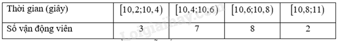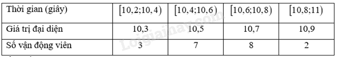 Thời gian chạy trung bình của các vận động viên là: \(\overline x  = \frac{1}{{20}}\left( {10,3.3 + 10,5.7 + 10,7.8 + 10,9.2} \right) = 10,59\) (giây)