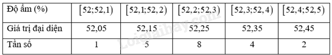 Độ ẩm trung bình trong 20 lần đo là: \(\overline x  = \frac{1}{{20}}\left( {52,05.1 + 52,15.5 + 52,25.8 + 52,35.4 + 52,45.2} \right) = 52,255\)