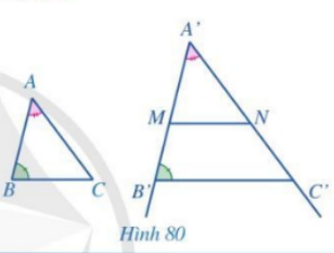 Cho hai tam giác ABC, A’B’C’ sao cho \(\widehat {A’} = \widehat A,\,\,\widehat {B’} = \widehat B\) và \(A’B’ \ne AB\) (Hình 80). Trên tia A’B’ lấy điểm M khác B thỏa mãn \(A’M = AB\). Qua M kẻ đường thẳng song song với B’C’ cắt tia A’C’ tại N. Chứng minh \(\Delta A’MN = \Delta ABC\). Từ đó suy ra \(\Delta A’B’C’ \backsim \Delta ABC\).