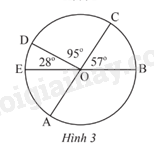 Suy ra ta có \(\widehat {EOA} = {180^o} – \widehat {COD} – \widehat {DOE} = {180^o} – {95^o} – {28^o} = {57^o}\)