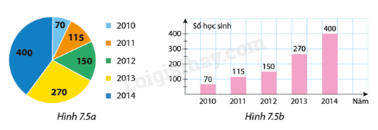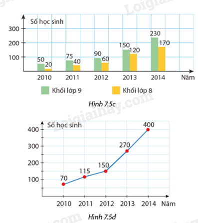 Với câu hỏi này, biểu đồ 7.5c thể hiện câu trả lời rõ nhất vì biểu đồ này biểu diễn chi tiết số học sinh của từng khối lớp dễ dàng quan sát sự chênh lệch giữa các khối. Ta so sánh từng cặp cột đứng gần nhau để biết số liệu năm sau tăng hay giảm so với năm trước.