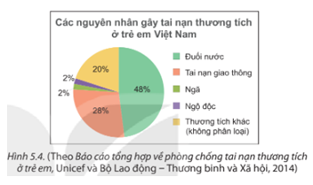 Từ biểu đồ Hình 5.4, em hãy lập bảng thống kê tỉ lệ các nguyên nhân gây tai nạn thương tích ở trẻ em Việt Nam.