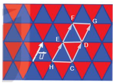 Ta thấy:  \(\overrightarrow {HE}  = \overrightarrow u ,\overrightarrow {CD}  = \overrightarrow u ,\overrightarrow {EF}  = \overrightarrow u \) nên phép tịnh tiến \({T_{\overrightarrow u }}\) biến các điểm H, C, E tương ứng thành E, D, F. Do đó, \({T_{\overrightarrow u }}\) biến tam giác HCE thành tam giác EDF hay phép tịnh tiến theo vectơ \(\overrightarrow u \) biến một viên gạch màu xanh thành một viên gạch màu xanh. Đối với các viên gạch màu xanh khác, thực hiện tương tự. Vậy phép tịnh tiến theo vectơ \(\overrightarrow u \) biến mỗi viên gạch màu xanh thành một viên gạch màu xanh.