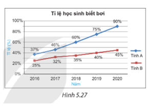 Biểu đồ Hình 5.27 cho biết tỉ lệ học sinh biết bơi của hai tỉnh A, B trong các năm từ 2016 đến 2020.