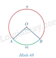 Quan sát góc ở tâm \(AOB\) (khác góc bẹt) ở Hình 48, cho biết trong hai phần đường tròn được tô màu xanh và màu đỏ, phần nào nằm bên trong, phần nào nằm bên ngoài góc \(AOB\).