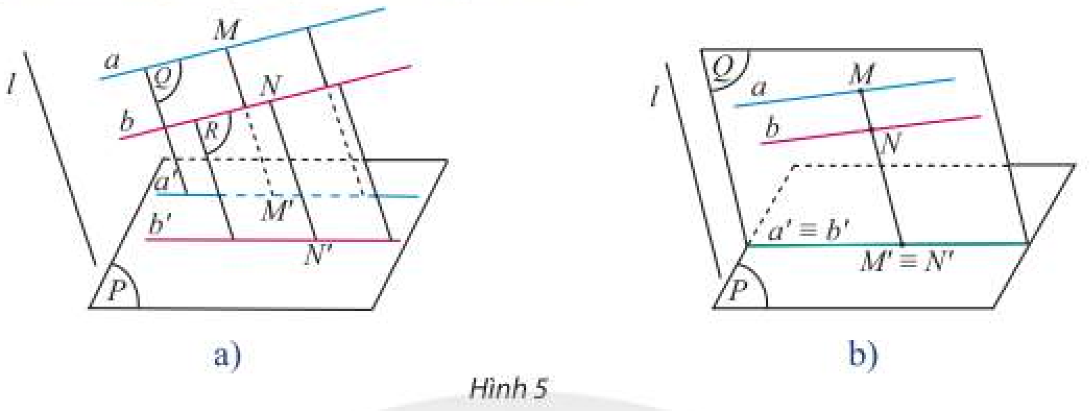 Trong Hình 5, xét phép chiếu theo phương \(l\) với mặt phẳng chiếu \(\left( P \right)\). Biết \(a\parallel b\) với \(a \subset \left( Q \right)\) và \(b \subset \left( R \right)\). Nêu nhận xét về vị trí tương đối của hình chiếu \(a’,b’\) của \(a,b\) trong hai trường hợp: \(\left( Q \right)\parallel \left( R \right);\left( Q \right) \equiv \left( R \right)\).