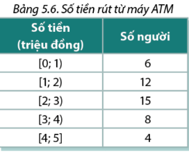 Thống kê lượng người và số tiền  (đơn vị : triệu đồng ) mà mỗi người rút ra ở một máy  ATM ( máy rút tiền tự động) trong một buổi sáng, ngân hàng X lập được bảng tần số ghép nhóm bên ( Bảng 5.6 )