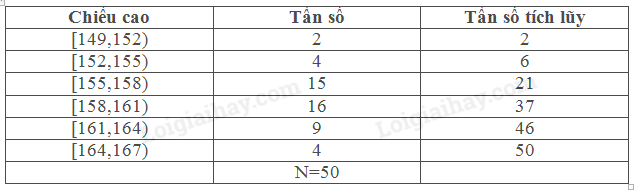 b, Ta có : \(\frac{N}{2} = \frac{{50}}{2} = 25\).Nhóm chứa trung vị  \({M_e}\)  là [158,161)