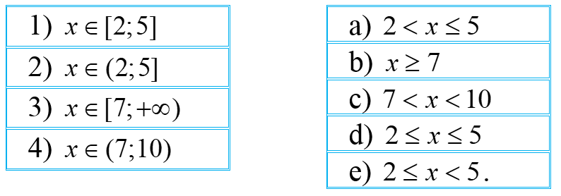 3) \(x \in [7; + \infty ) \Leftrightarrow x \ge 7\). Nối 3) với b)