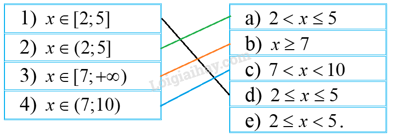 4) \(x \in (7;10) \Leftrightarrow 7 < x < 10\). Nối 4) với c)
