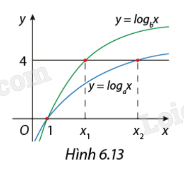Hàm số \(y = {\log _a}x\) và \(y = {\log _b}x\) có đồ thị như Hình 6.13. Đường thẳng y = 4 cắt hai đồ thị tại các điểm có hoành độ x1, x2. Biết rằng x1 = 2x2. Tính giá trị của \(\frac{a}{b}\).