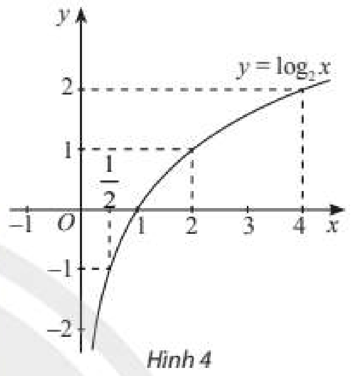 ii) Trong mặt phẳng toạ độ \(Oxy\), xác định các điểm có toạ độ như bảng trên. Làm tương tự, lấy nhiều điểm \(M\left( {x;{{\log }_2}x} \right)\) với \(x > 0\) và nối lại ta được đồ thị hàm số \(y = {\log _2}x\) như Hình 4. Từ đồ thị này, nêu nhận xét về tính liên tục, tính đồng biến, nghịch biến, giới hạn khi \(x \to  + \infty ,x \to {0^ + }\) và tập giá trị của hàm số đã cho.