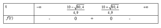 Do đó để \(h(t) > 5\)thì \(t \in \left( {\frac{{10 – \sqrt {80,4} }}{{4,9}};\frac{{10 + \sqrt {80,4} }}{{4,9}}} \right)\)