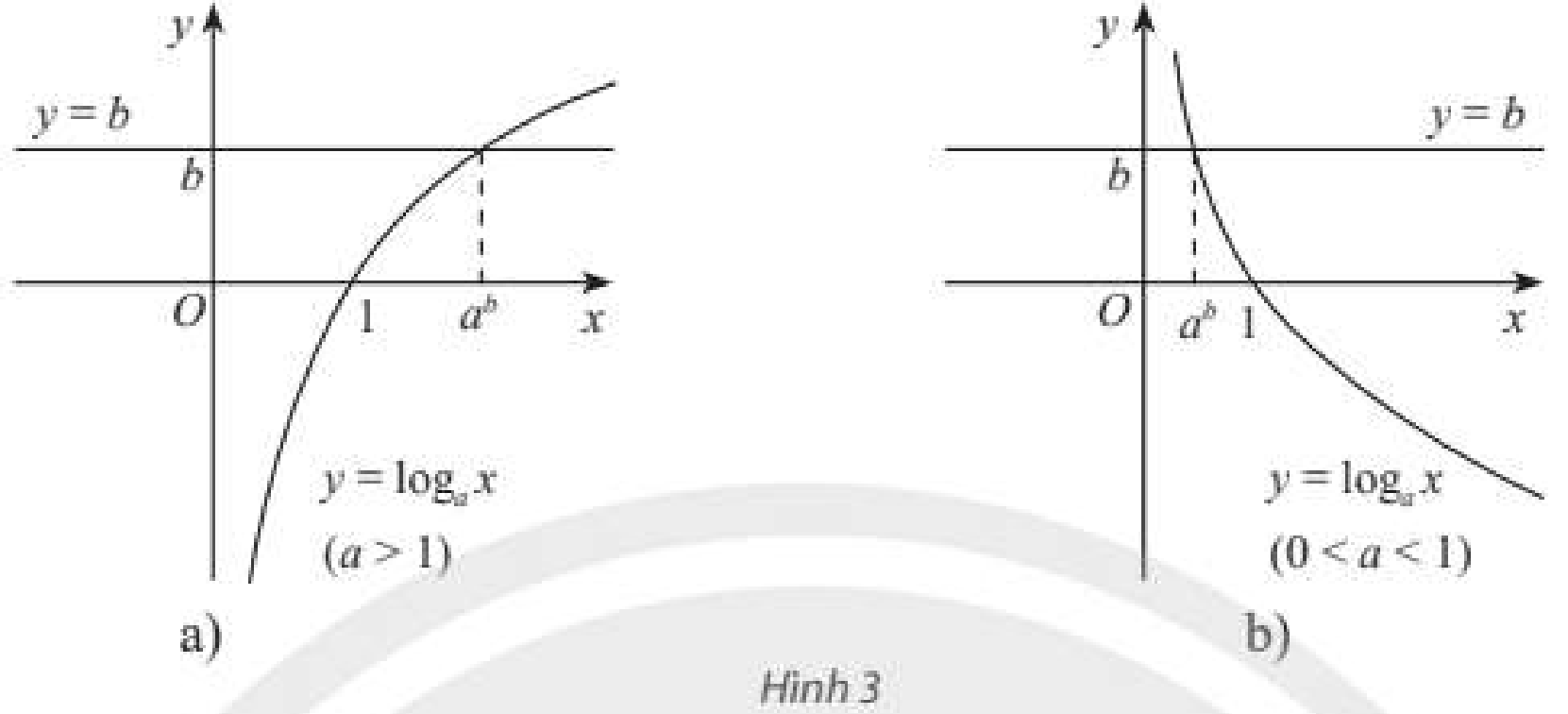 Cho đồ thị của hai hàm số \(y = {\log _a}x\left( {a > 0,a \ne 1} \right)\) và \(y = b\) như Hình 3a (với \(a > 1\)) hay Hình 3b (với \(0 < a < 1\)). Từ đây hãy nhận xét về số nghiệm và công thức nghiệm của phương trình \({\log _a}x = b\).