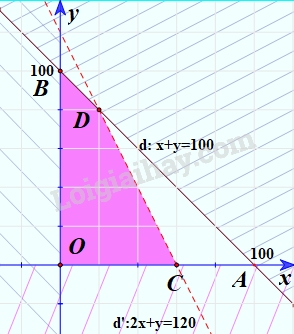 Do đó, miền nghiệm của bất phương trình \(x + y \le 100\) là nửa mặt phẳng bờ d chứa gốc tọa độ O.