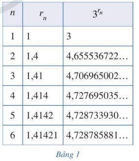 Xét số vô tỉ: \(\sqrt 2  = 1,4142135624…\). Xét dãy số hữu tỉ: \({r_1} = 1;{r_2} = 1,4;{r_3} = 1,41;{r_4} = 1,414;{r_5} = 1,4142;{r_6} = 1,41421;…\) và \(\lim {r_n} = \sqrt 2 \). Bằng cách tính \({3^{{r_n}}}\) tương ứng, ta nhận được Bảng 1 ghi các dãy số \(\left( {{r_n}} \right)\) và \(\left( {{3^{{r_n}}}} \right)\) với n = 1, 2, …, 6. Người ta chứng minh được rằng khi \(n \to  + \infty \) thì dãy số \(\left( {{3^{{r_n}}}} \right)\) dần đến một giới hạn mà ta gọi là \({3^{\sqrt 2 }}\). Nêu dự đoán về giá trị của số \({3^{\sqrt 2 }}\) (đến hàng phần trăm).