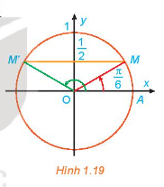 a) Từ Hình 1.19, ta thấy đường thẳng \(y = \frac{1}{2}\) cắt đường tròn tại 2 điểm M, M’. Ta có nghiệm của phương trình là: \(\frac{\pi }{6}, – \frac{{5\pi }}{6}\)