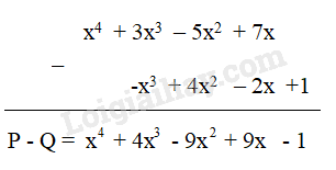 Ta có: P – Q = x4 + 3x3 – 5x2 + 7x – (-x3 + 4x2 – 2x +1)
