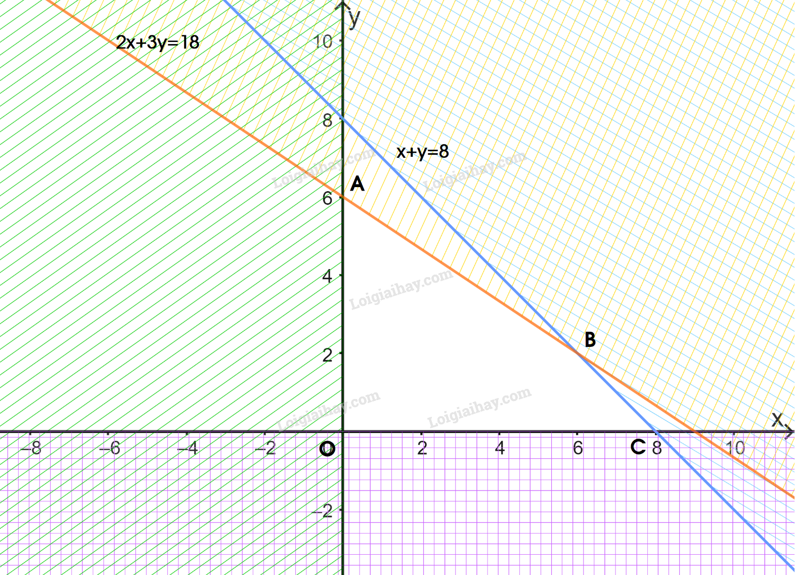 Biểu diễn miền nghiệm của hệ bất phương trình: \(\left\{ \begin{array}{l}x + y \le 8\\2x + 3y \le 18\\x \ge 0\\y \ge 0\end{array} \right.\)