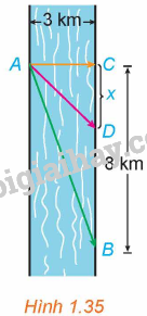 Anh An chèo thuyền từ điểm A trên bờ một con sông thẳng rộng 3km và muốn đến điểm B ở bờ đối diện cách 8km về phía hạ lưu càng nhanh càng tốt (H.1.35). Anh An có thể chèo thuyền trực tiếp qua sông đến điểm C rồi chạy bộ đến B, hoặc anh có thể chèo thuyển thẳng đến B, hoặc anh cũng có thể chèo thuyền đến một điểm D nào đó giữa C và B rồi chạy bộ đến B. Nếu vận tốc chèo thuyền là 6km/h và vận tốc chạy bộ là 8km/h thì anh An phải chèo thuyền sang bờ ở điểm nào để đến B càng sớm càng tốt? (Giả sử rằng vận tốc của nước là không đáng kể so với vận tốc chèo thuyền của anh An).