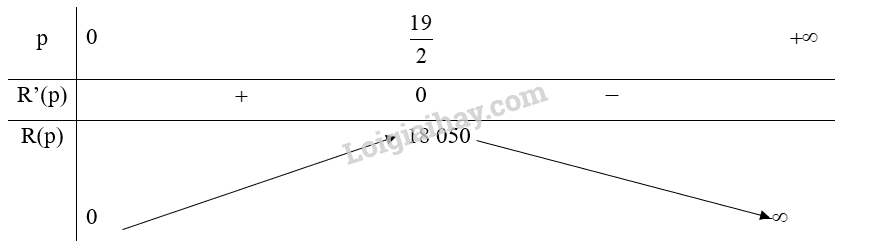 Ta có: \(R’\left( p \right) =  – 400p + 3\;800,R’\left( p \right) = 0 \Leftrightarrow p = \frac{{19}}{2}\)