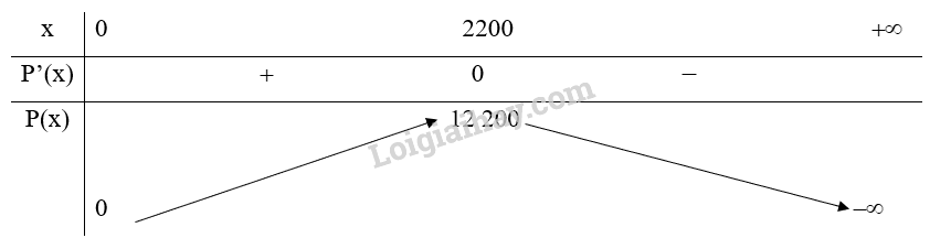 Ta có: \(P’\left( x \right) = \frac{{ – x}}{{100}} + 22,P’\left( x \right) = 0 \Leftrightarrow x = 2\;200\)